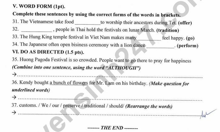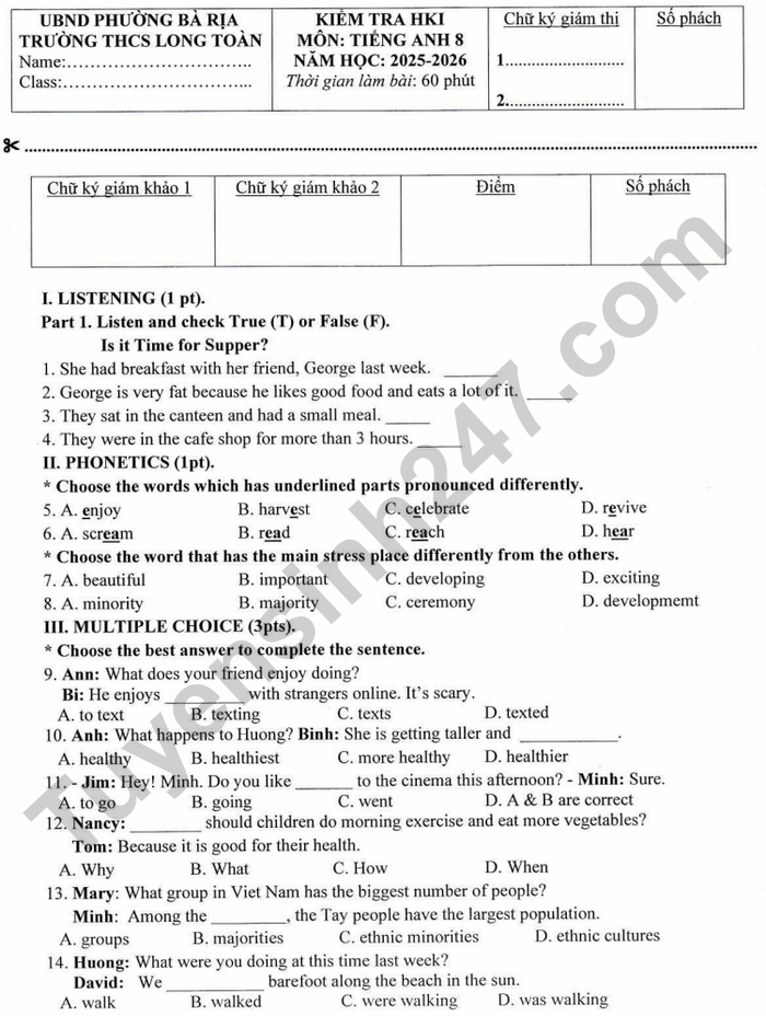 Đề thi cuối kì 1 Anh lớp 8 THCS Long Toàn 2025