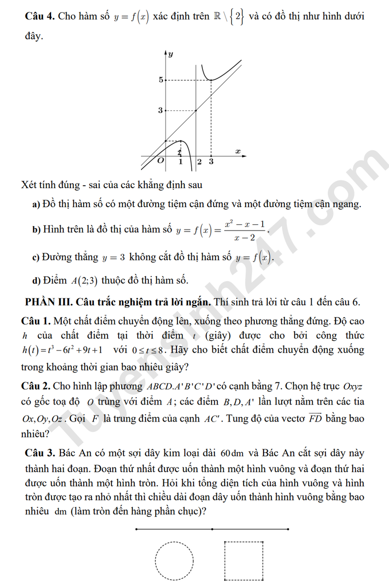 Câu 3. Bác An có một sợi dây kim loại dài 60dm và Bác An cắt sợi dây này thành hai đoạn. Đoạn thứ nhất được uốn thành một hình vuông và đoạn thứ hai được uốn thành một hình tròn. Hỏi khi tổng diện tích của hình vuông và hình tròn được tạo ra nhỏ nhất thì chiều dài đoạn dây uốn thành hình vuông bằng bao nhiêu dm (làm tròn đến hàng phần chục)?