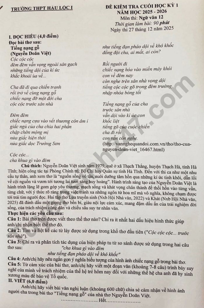 Đề thi cuối kì 1 lớp 12 môn Văn 2025 - THPT Hậu Lộc I