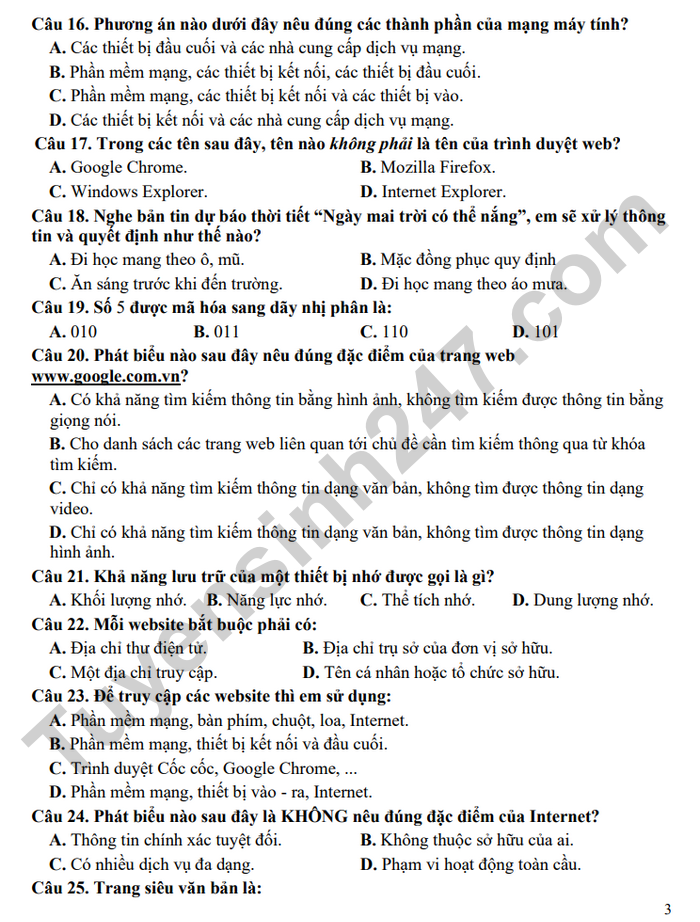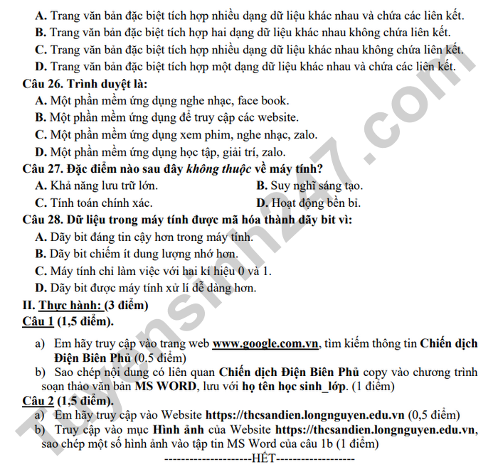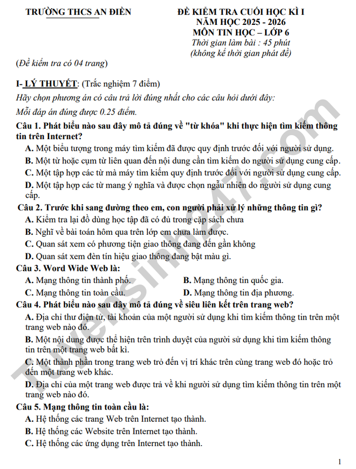 Đề thi cuối kì 1 môn Tin lớp 6 THCS An Điền 2025