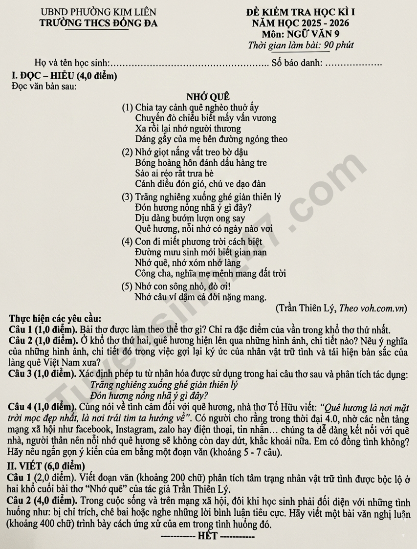 Đề thi cuối kì 1 môn Văn lớp 9 năm 2025 - THCS Đống Đa