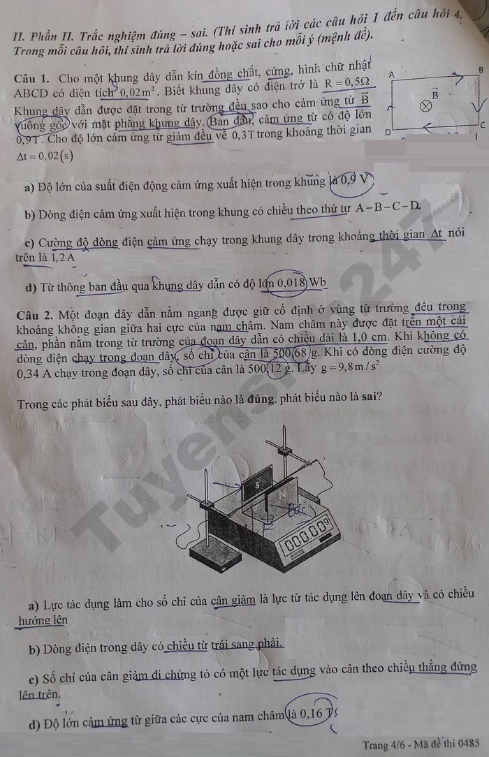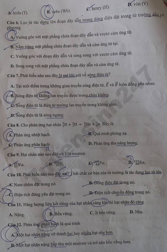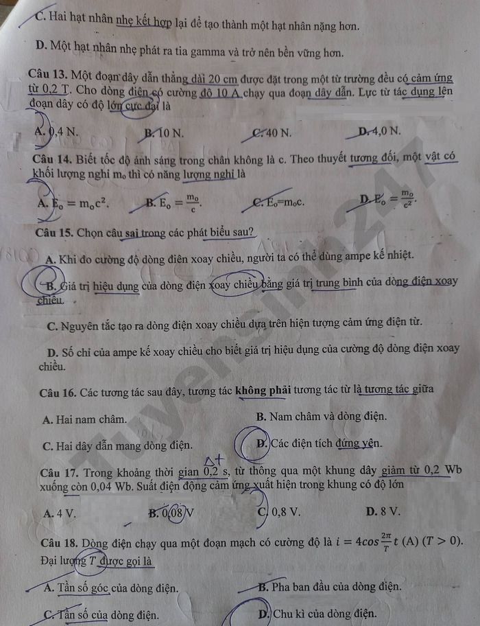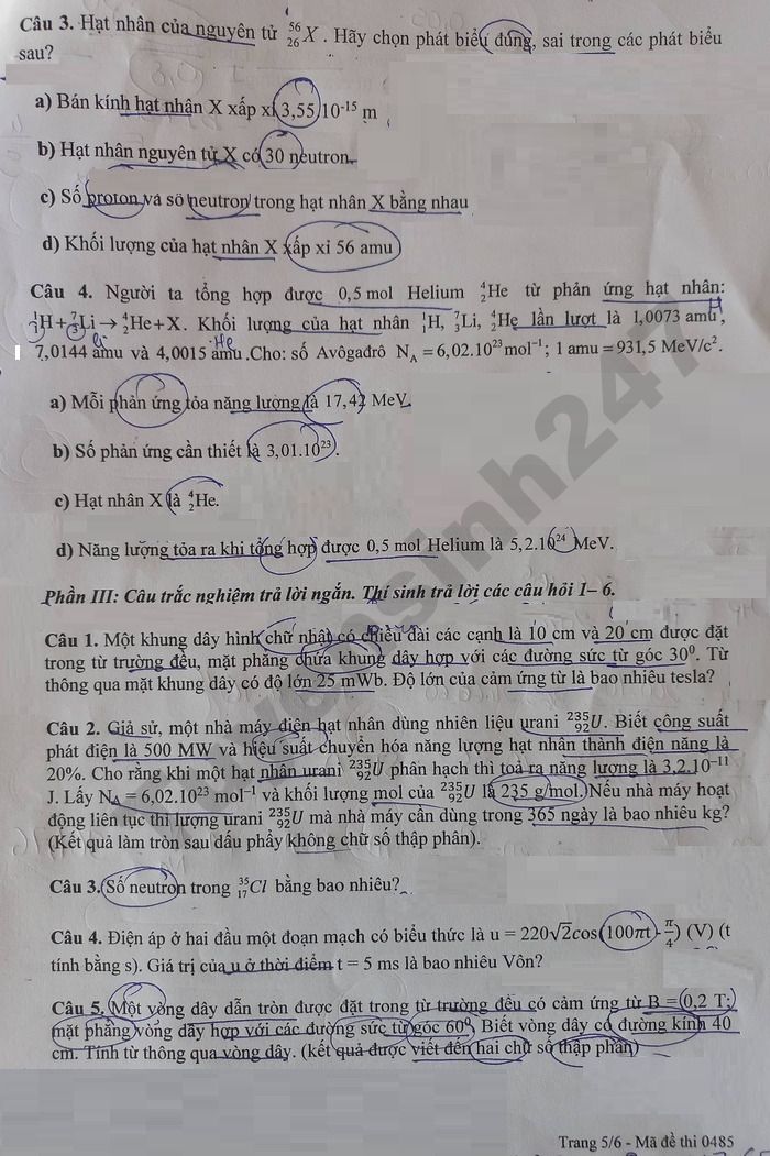 Lưu ý: Đáp án trong đề là bài làm của học sinh, có thể không chính xác