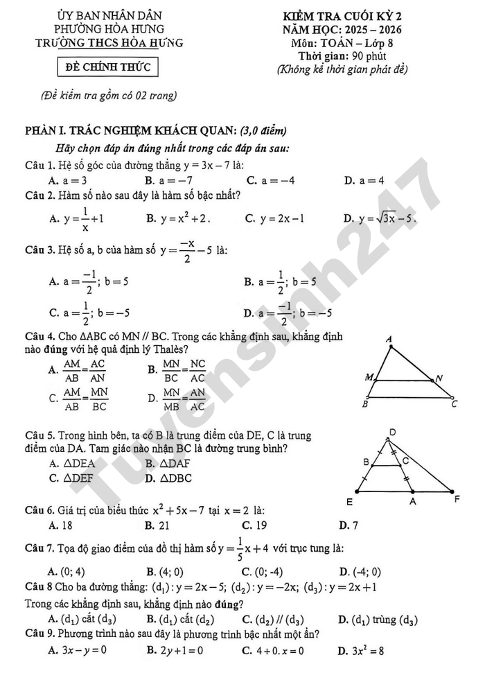 Đề thi cuối kì 2 lớp 8 môn Toán 2026 - THCS Hòa Hưng