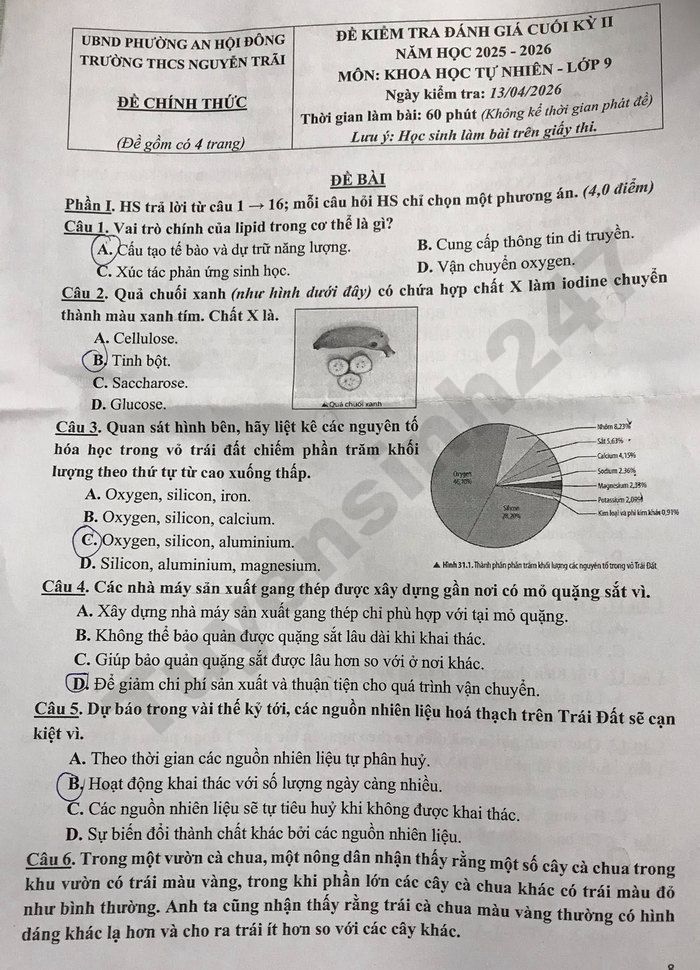 Đề thi cuối kì 2 lớp 9 môn KHTN 2026 - THCS Nguyễn Trãi
