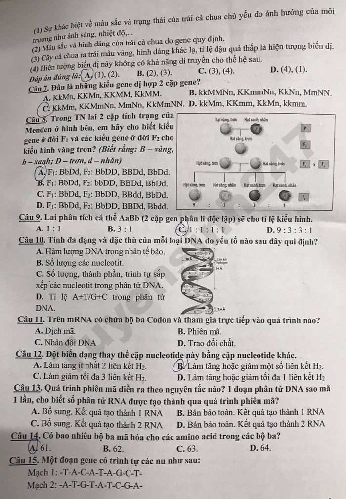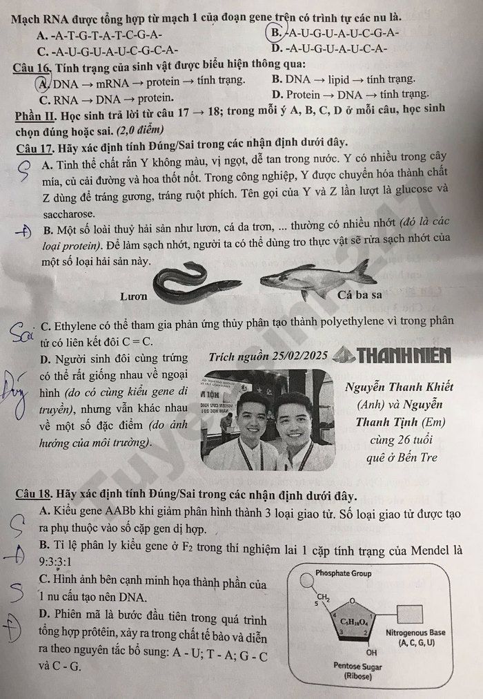 Lưu ý: Đáp án trong đề là bài làm của học sinh, có thể không chính xác