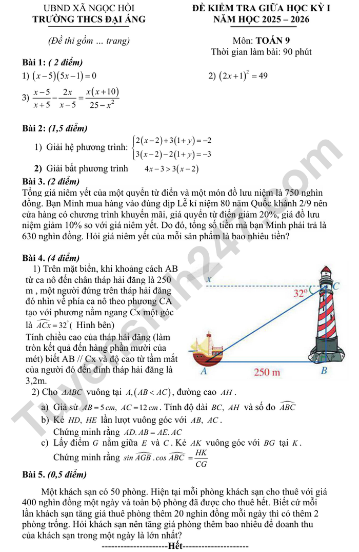 Đề thi giữa học kì 1 Toán 9 THCS Đại Áng 2025