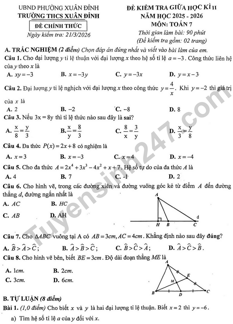 Đề thi giữa học kì 2 Toán 7 năm 2025 – 2026 trường THCS Xuân Đỉnh – Hà Nội