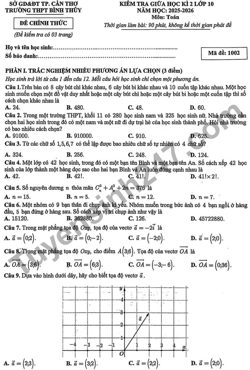 Đề giữa học kì 2 Toán 10 trường THPT Bình Thủy năm 2026