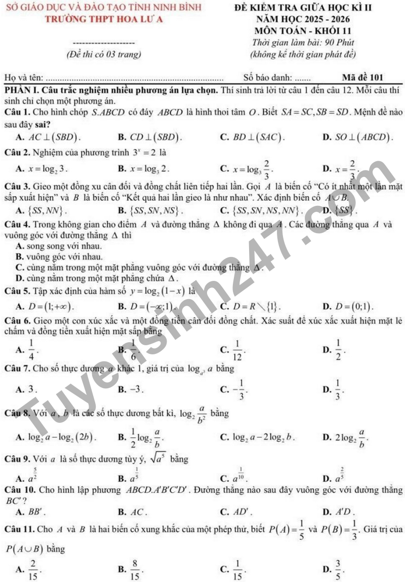 Đề giữa kì 2 Toán 11 trường THPT Hoa Lư A năm 2026