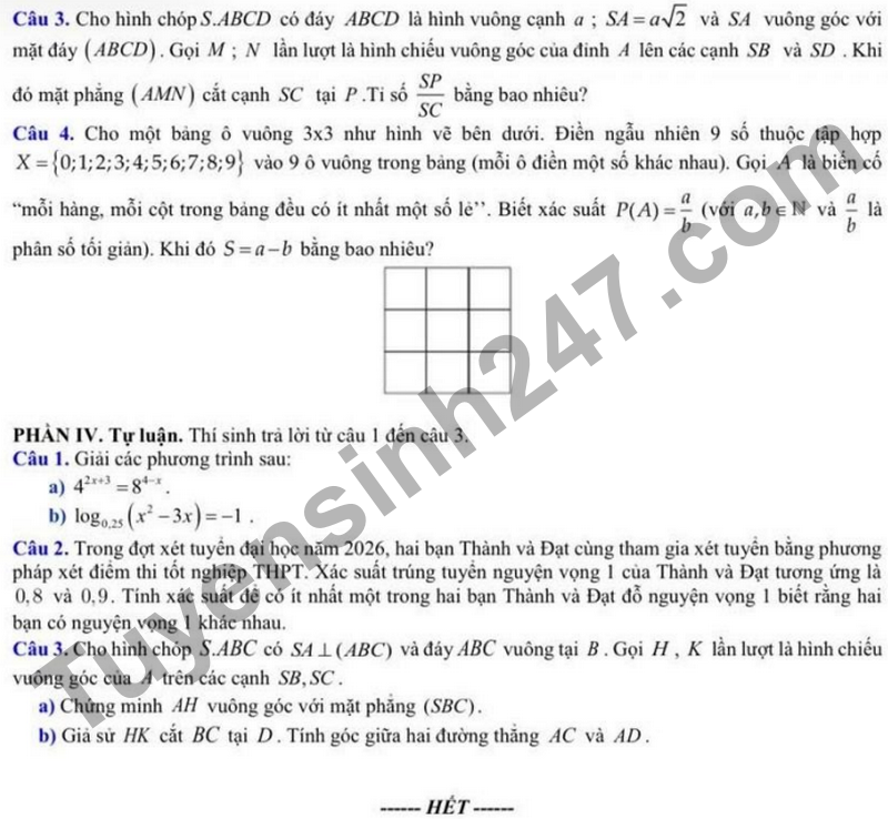Câu 2. Trong đợt xết tuyển đại học năm 2026, hai bạn Thành và Đạt cùng tham gia xét tuyển bằng phương pháp xét điểm thi tốt nghiệp THPT. Xác suất trúng tuyển nguyện vọng 1 của Thành và Đạt tương ứng là 0,8 và 0,9. Tính xác suất để có ít nhất một trong hai bạn Thành và Đạt đỗ nguyện vọng 1 biết rằng hai bạn có nguyện vọng 1 khác nhau.