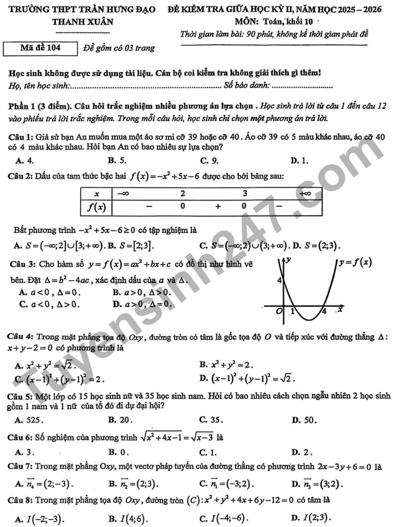 Đề giữa kỳ 2 Toán 10 trường THPT Trần Hưng Đạo năm 2026