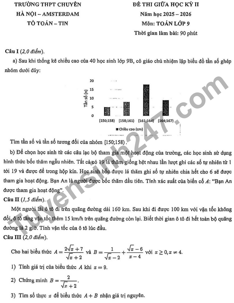 Đề thi giữa học kỳ 2 Toán 9 năm 2026 trường chuyên Hà Nội – Amsterdam