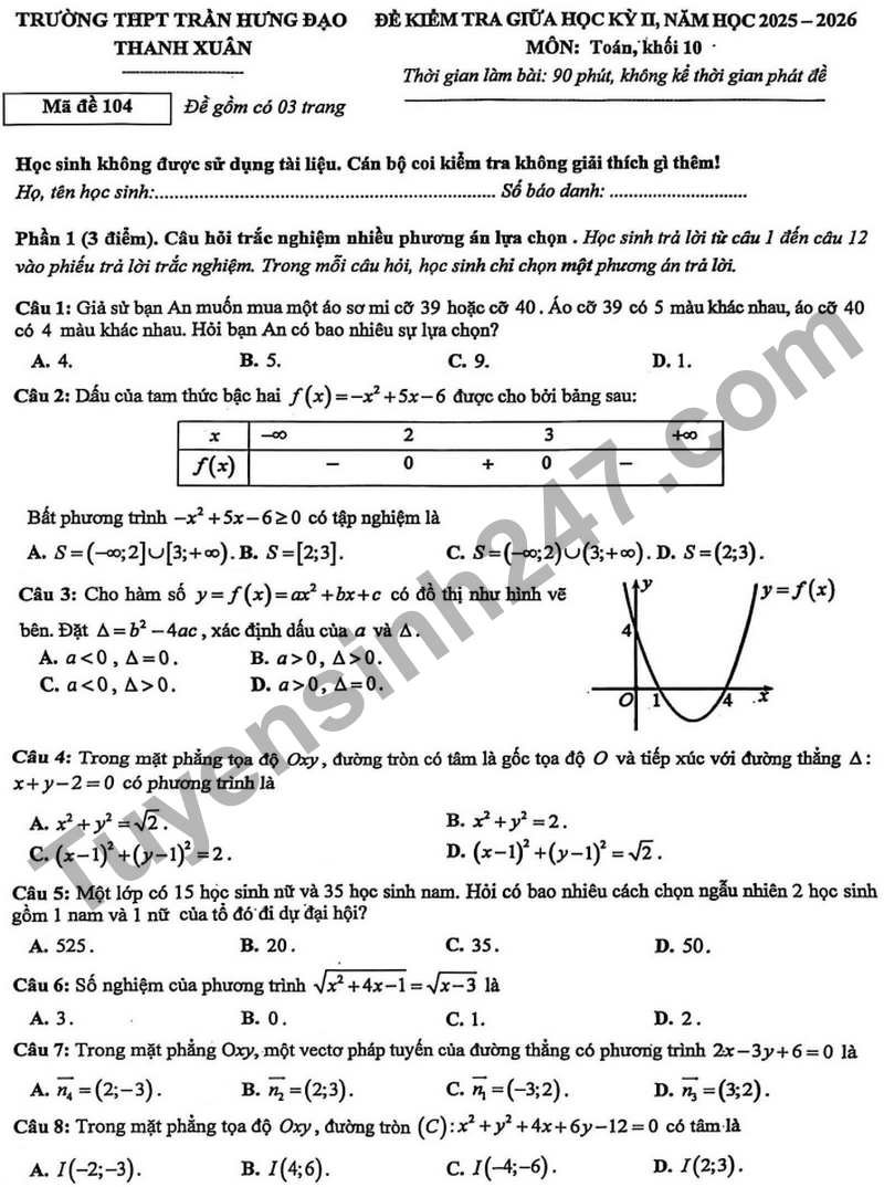 Đề giữa kỳ 2 Toán 10 trường THPT Trần Hưng Đạo năm 2026