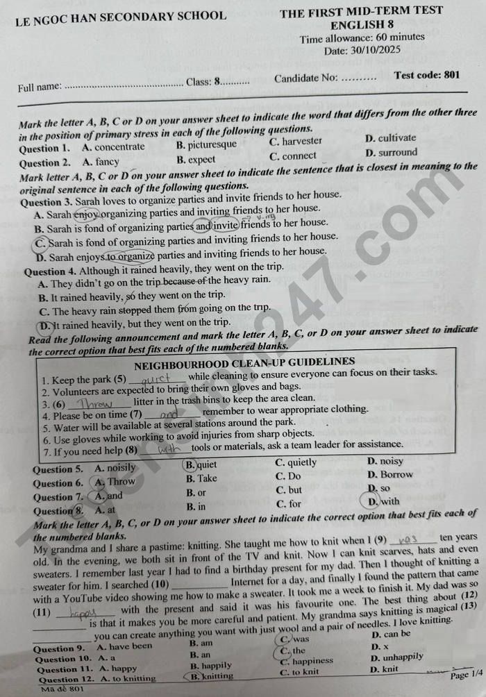 Đề thi giữa kì 1 Anh lớp 8 THCS Lê Ngọc Hân 2025