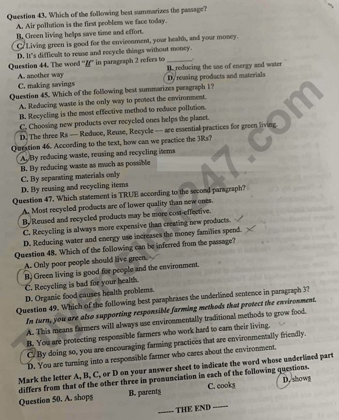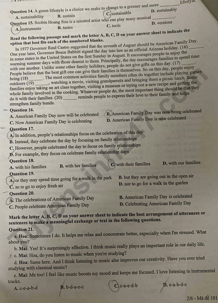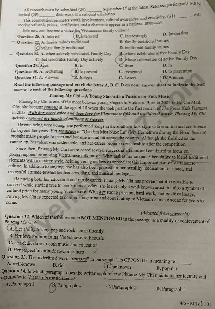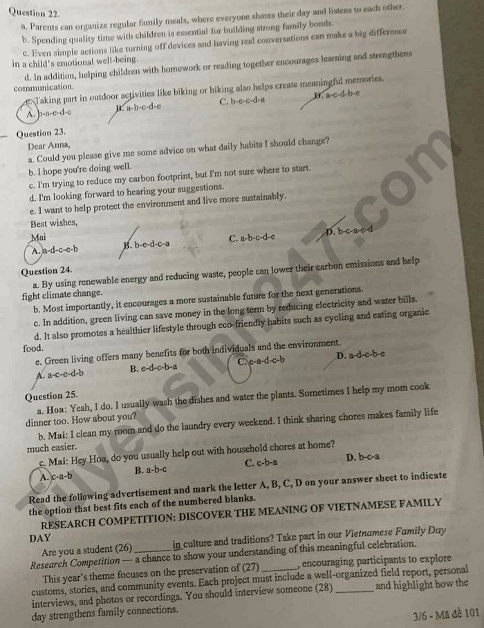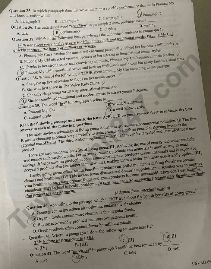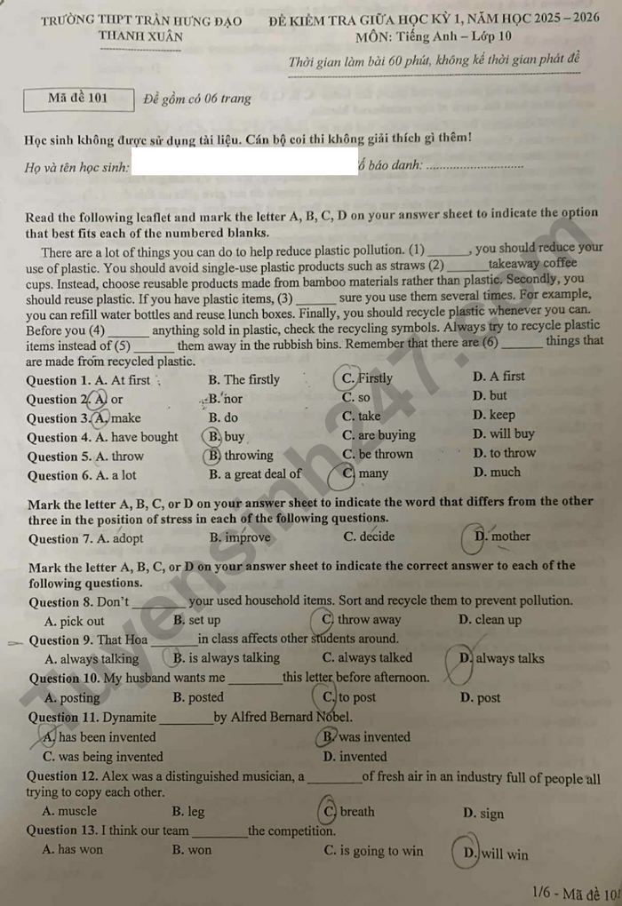 Lưu ý: Đáp án trong đề là bài làm của học sinh, có thể không chính xác