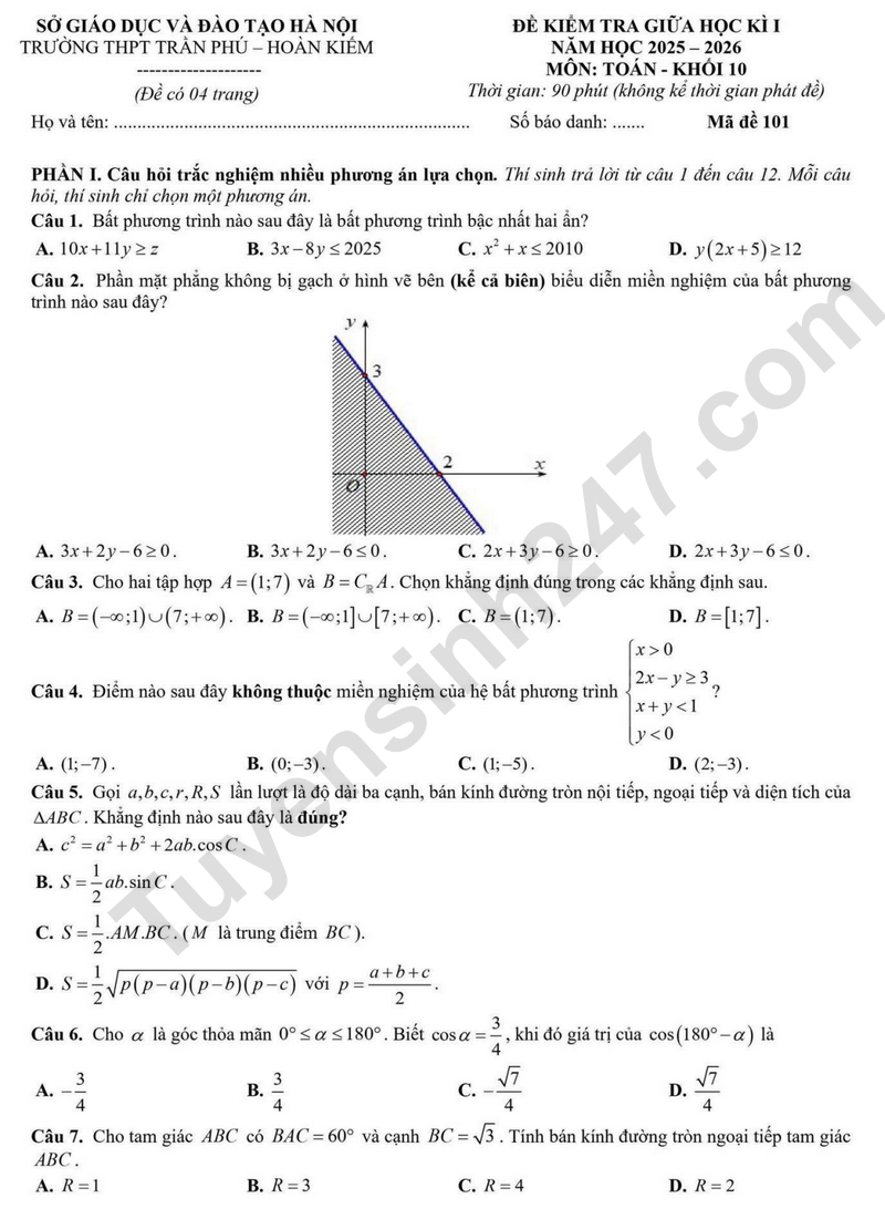 Đề thi giữa kì 1 lớp 10 môn Toán 2025 - THPT Trần Phú
