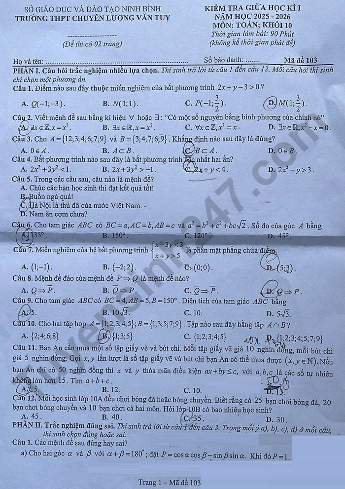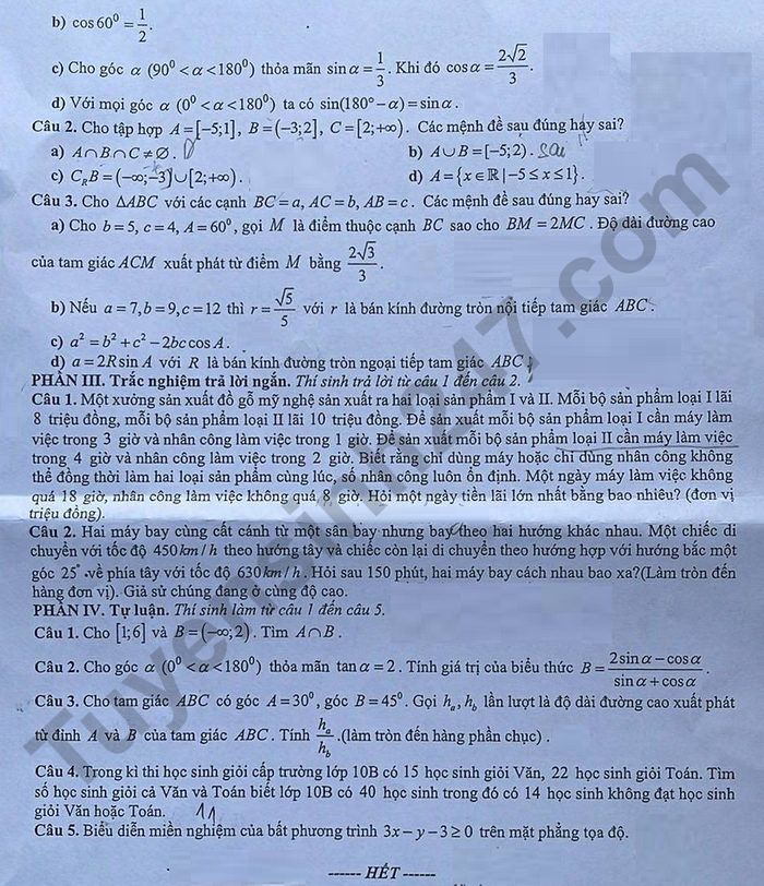 Lưu ý: Đáp án trong đề là bài làm của học sinh, có thể không chính xác