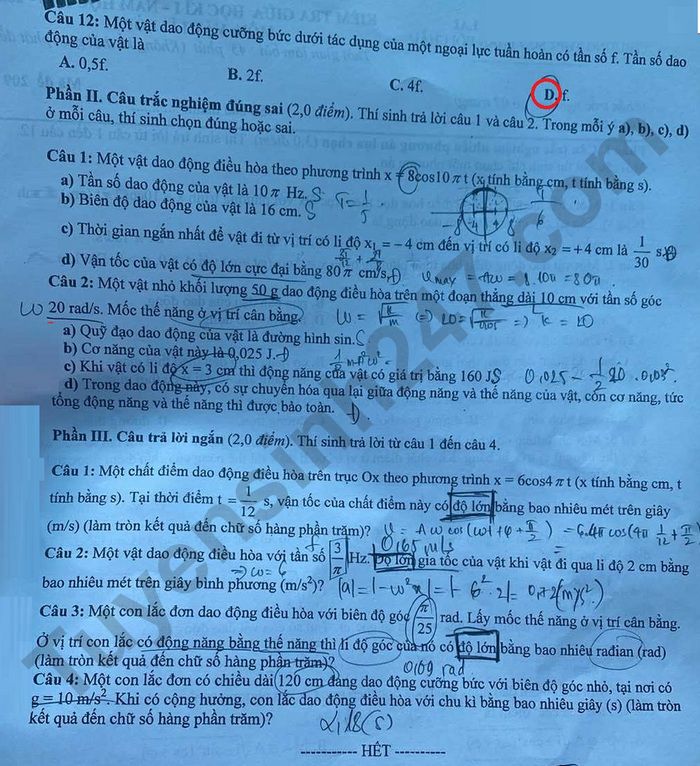 Câu 1: Một chất điểm dao động điều hòa trên trục Ox theo phương trình x = 6cos4rt (x tính bằng cm, t tính bằng s). Tại thời điểm t = 1/12s, vận tốc của chất điểm này có độ lớn bằng bao nhiêu mét trên giây (m/s) (làm tròn kết quả đến chữ số hàng phần trăm)?