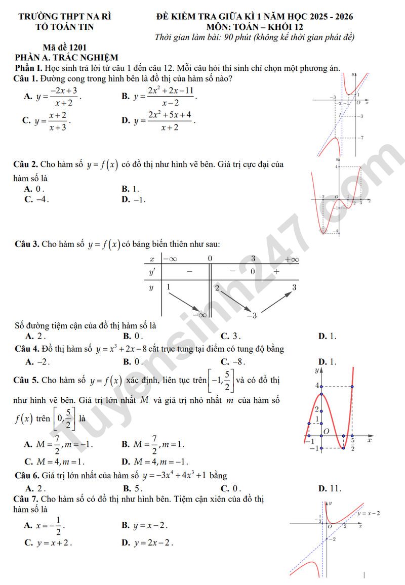 Đề thi giữa kì 1 lớp 12 môn Toán 2025 - THPT Na Rì