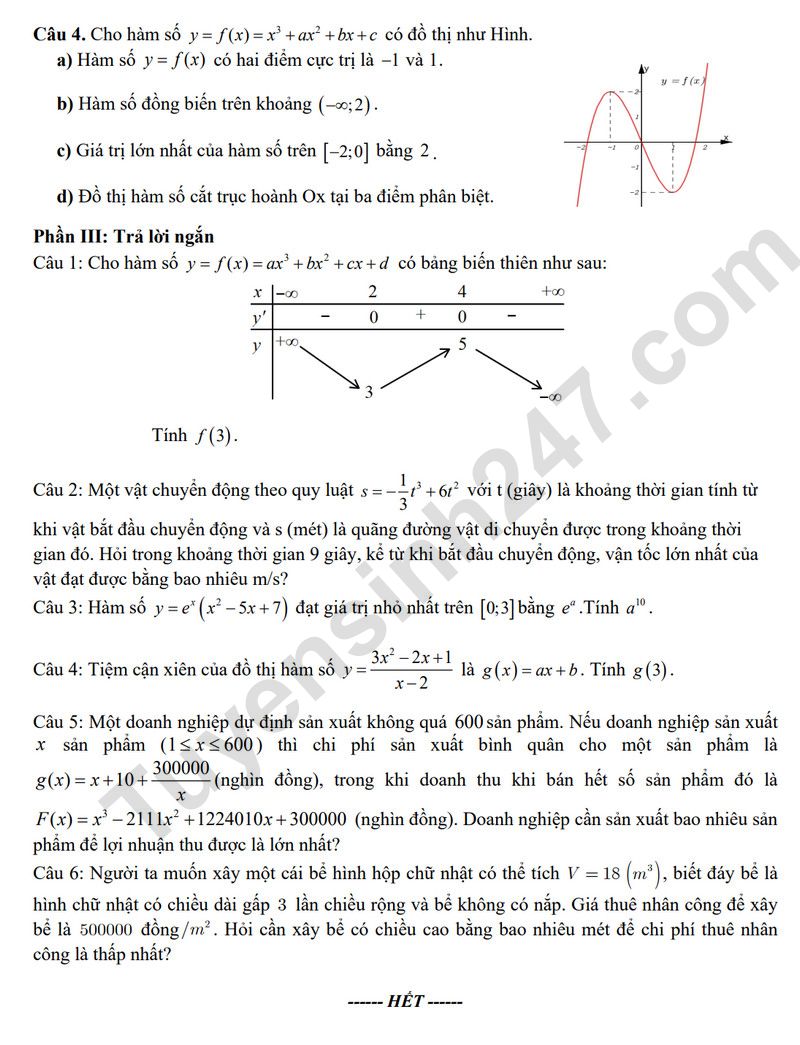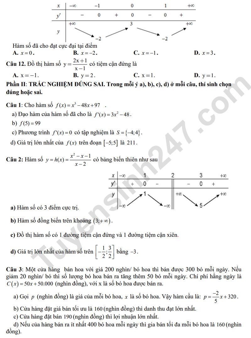 Câu 3: Một cửa hàng bán hoa với giá 200 nghìn/ bó hoa thì bán được 300 bó mỗi ngày. Nếu giảm 20 nghìn/ bó thì số lượng bó hoa bán ra tăng thêm 50 bó mỗi ngày. Chí phí hằng ngày là Cx x ( ) = + 50 50.000 (nghìn đồng), với x là số bó hoa được bán ra.