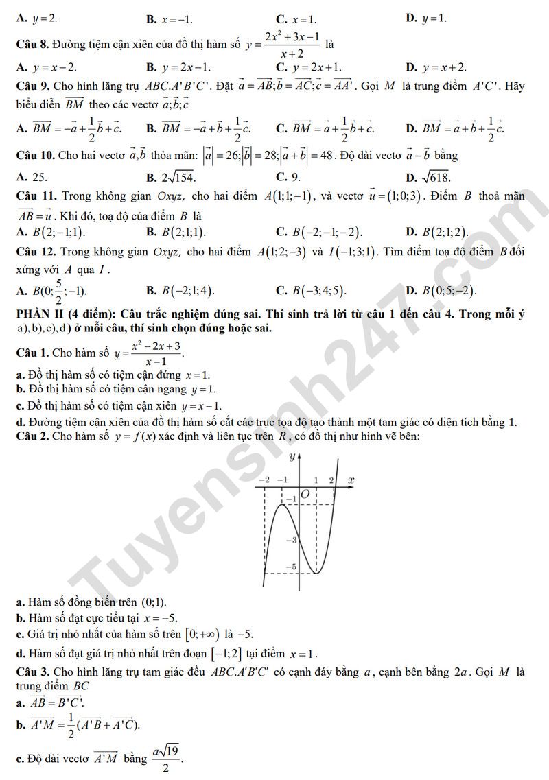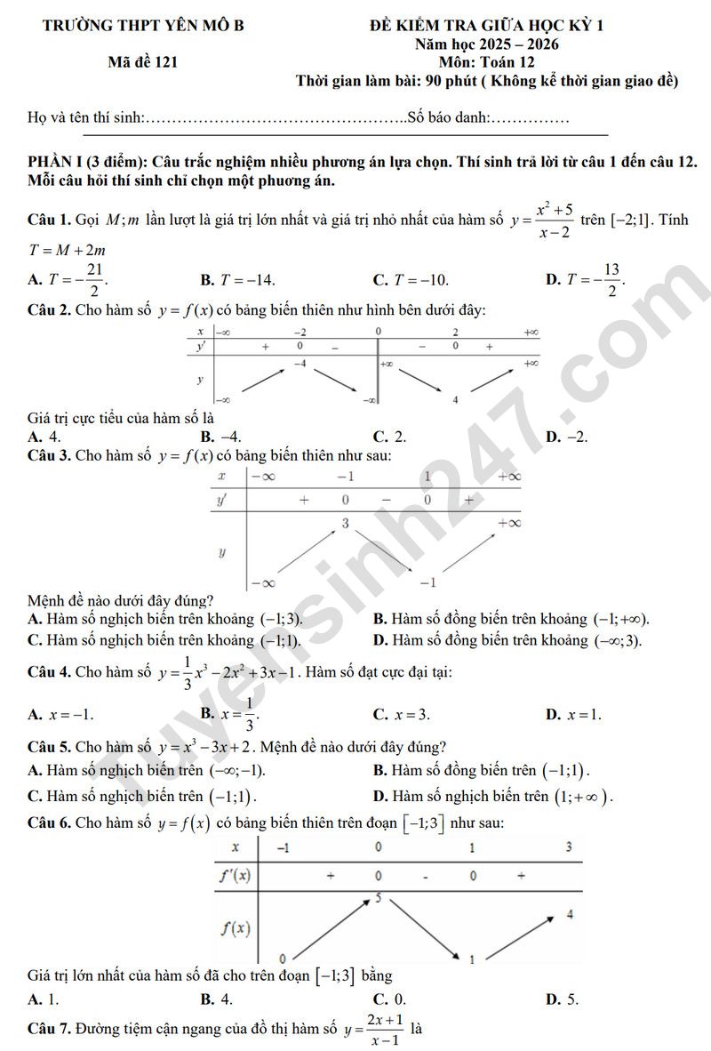 Đề thi giữa kì 1 lớp 12 môn Toán 2025 - THPT Yên Mô