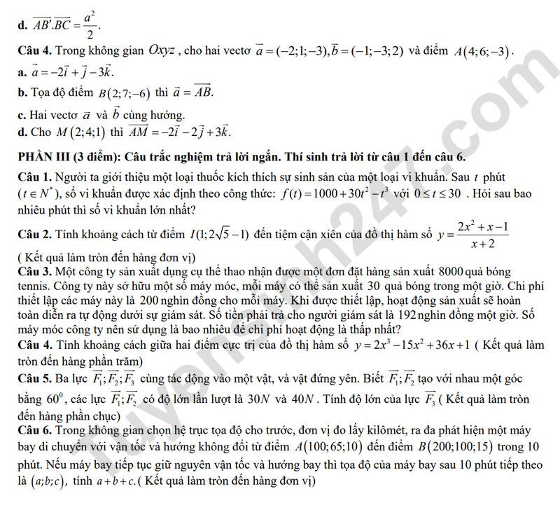 Câu 6. Trong không gian chọn hệ trục tọa độ cho trước, đơn vị đo lấy kilômét, ra đa phát hiện một máy bay di chuyển với vận tốc và hướng không đổi từ điểm A(100;65;10) đến điểm B(200;100;15) trong 10 phút. Nếu máy bay tiếp tục giữ nguyên vận tốc và hướng bay thì tọa độ của máy bay sau 10 phút tiếp theo là (abc ;; ,) tính a+b+c.( Kết quả làm tròn đến hàng đơn vị)