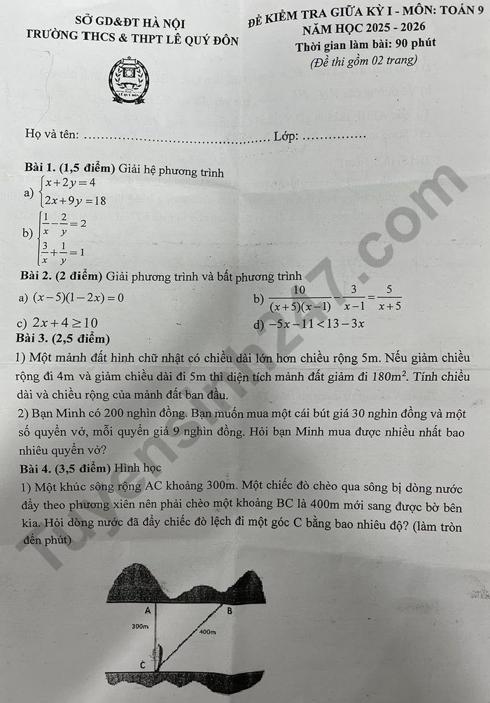 Đề thi giữa kì 1 lớp 9 môn Toán 2025 - THCS&THPT Lê Quý Đôn