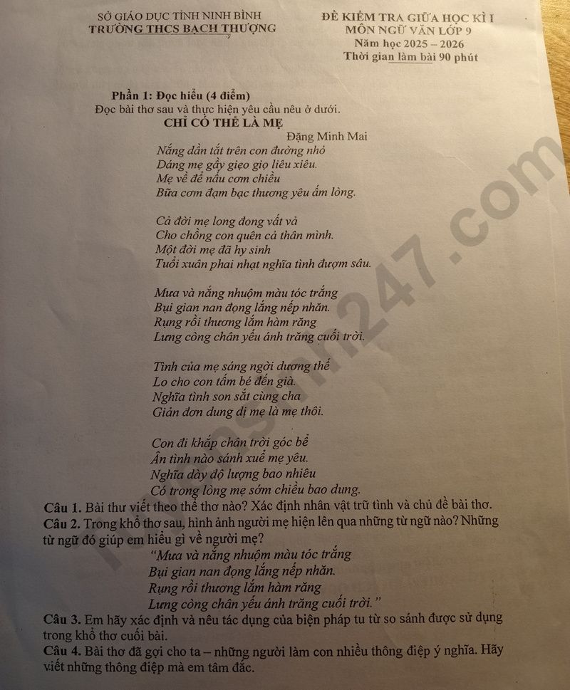 Đề thi giữa kì 1 lớp 9 môn Văn 2025 - THCS Bạch Thượng
