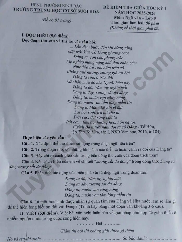 Đề thi giữa kì 1 lớp 9 môn Văn 2025 - THCS Suối Hoa