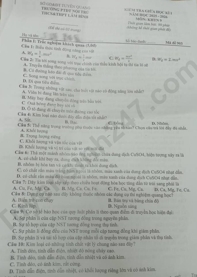 Đề thi giữa kì 1 lớp 9 năm 2025 môn KHTN - THCS THPT Lâm Bình