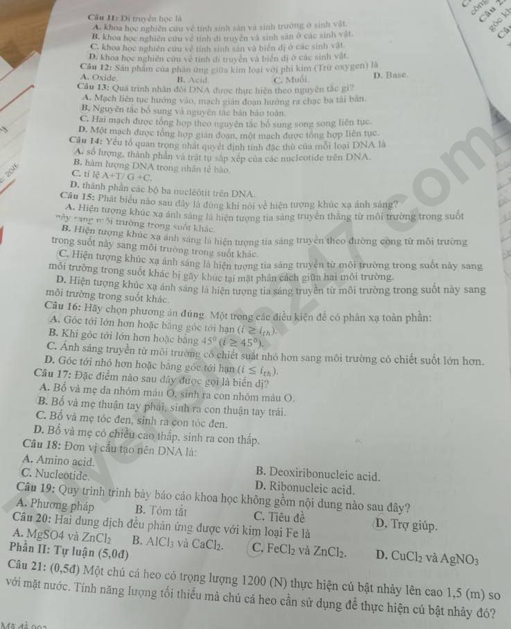 Câu 24: (0,5đ) Nước có chiết suất 133. Chiêu ánh sáng từ nước ra ngoài không khí, góc có thể xảy ra hiện tượng phản xạ toàn phần là giá trị bao nhiêu?