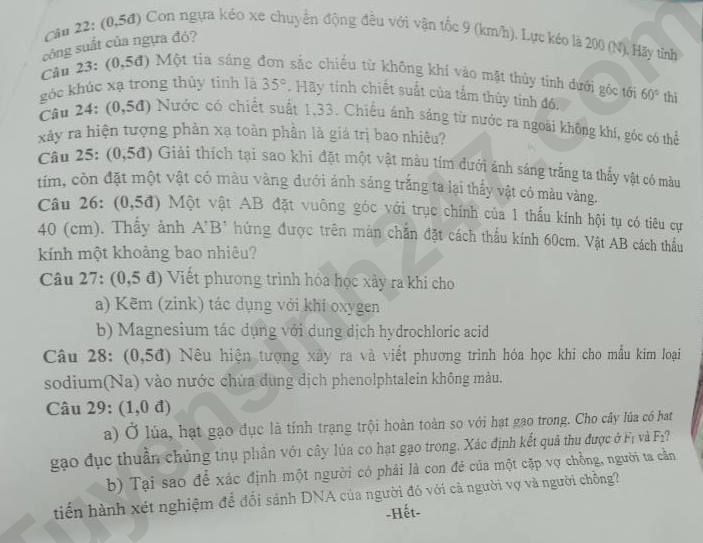 Cầu 25: (0,5đ) Giải thích tại sao khi đặt một vật màu tím dưới ánh sáng trắng ta thấy vật có màu tim, còn đặt một vật có màu vàng dưới ánh sáng trắng ta lại thấy vật cỏ màu vàng.