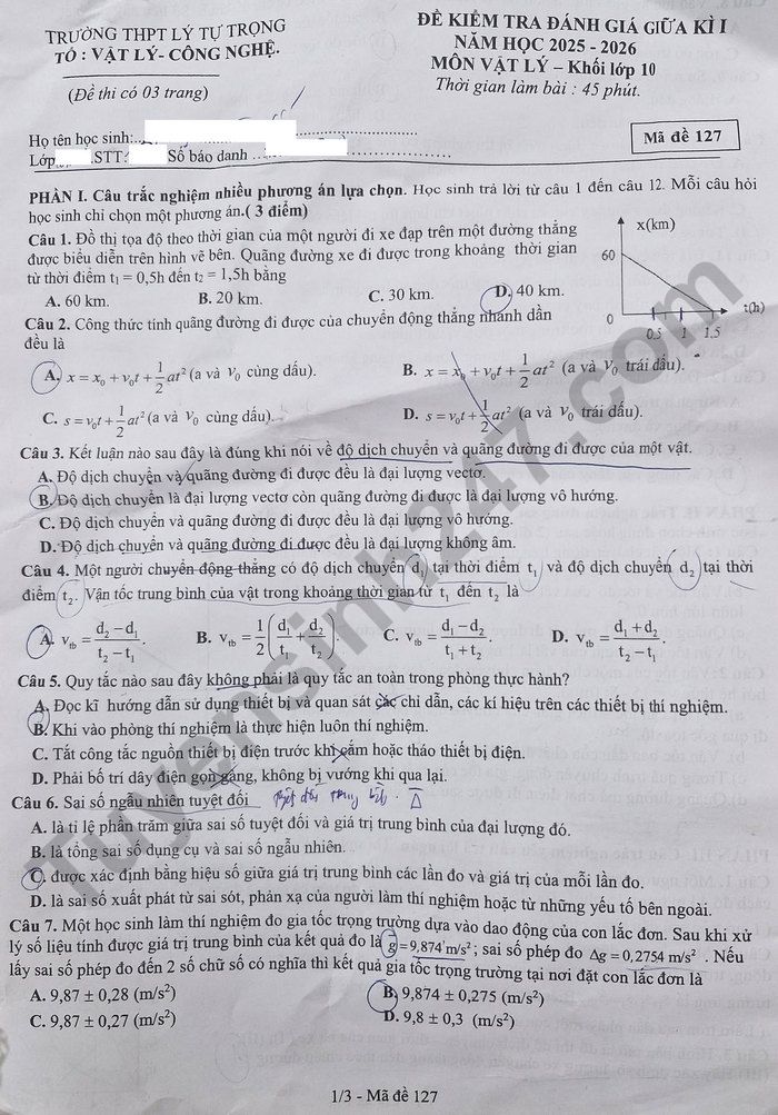 Lưu ý: Đáp án trong đề là bài làm của học sinh, có thể không chính xác