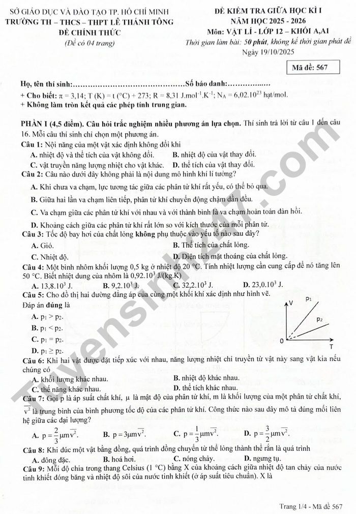 Đề thi giữa kì 1 môn Lý lớp 12 TH-THCS-THPT Lê Thánh Tông 2025