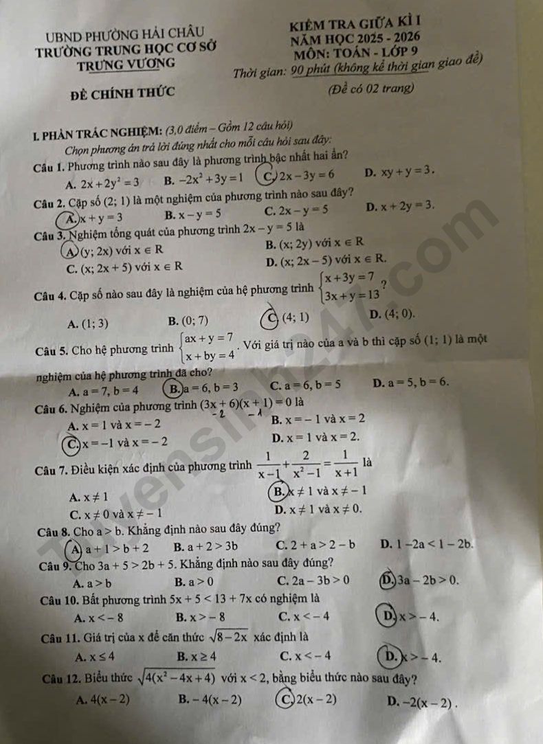 Đề thi giữa kì 1 môn Toán lớp 9 năm 2025 - THCS Trưng Vương