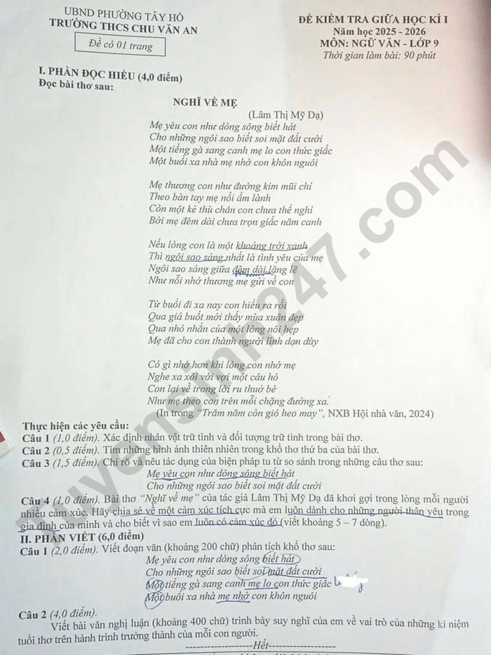 Đề thi giữa kì 1 môn Văn 9 THCS Chu Văn An 2025