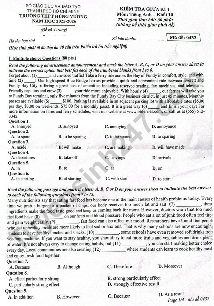 Đề thi giữa kì 1 năm 2025 lớp 10 môn Anh - THPT Hùng Vương