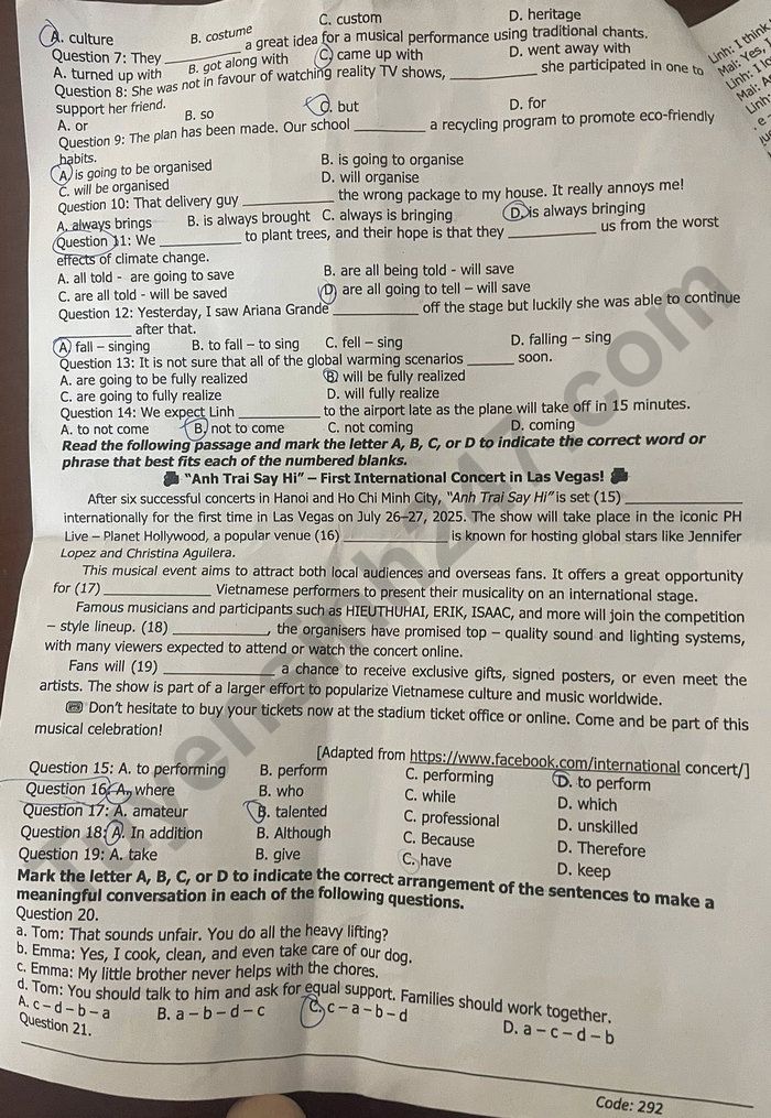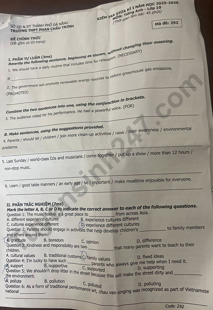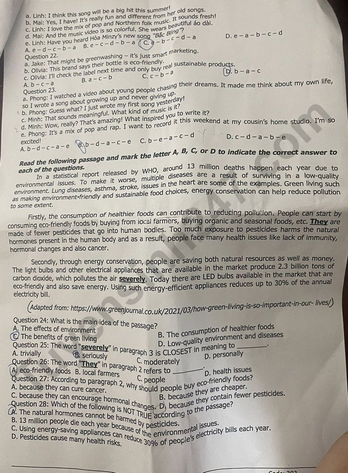 Lưu ý: Đáp án trong đề là bài làm của học sinh, có thể không chính xác