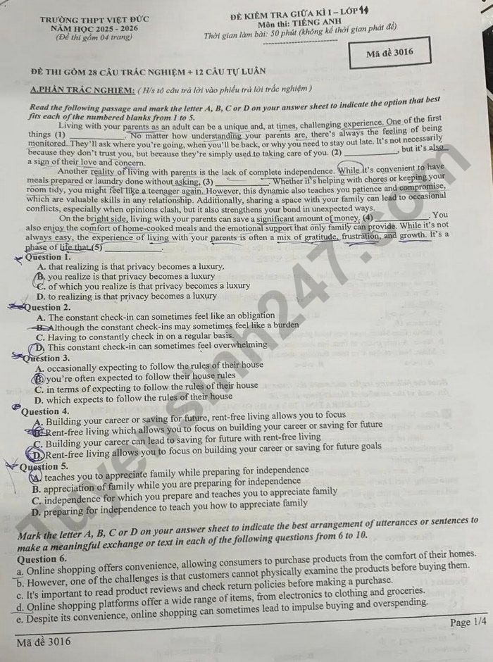 Đề thi giữa kì 1 năm 2025 môn Anh 11 - THPT Việt Đức