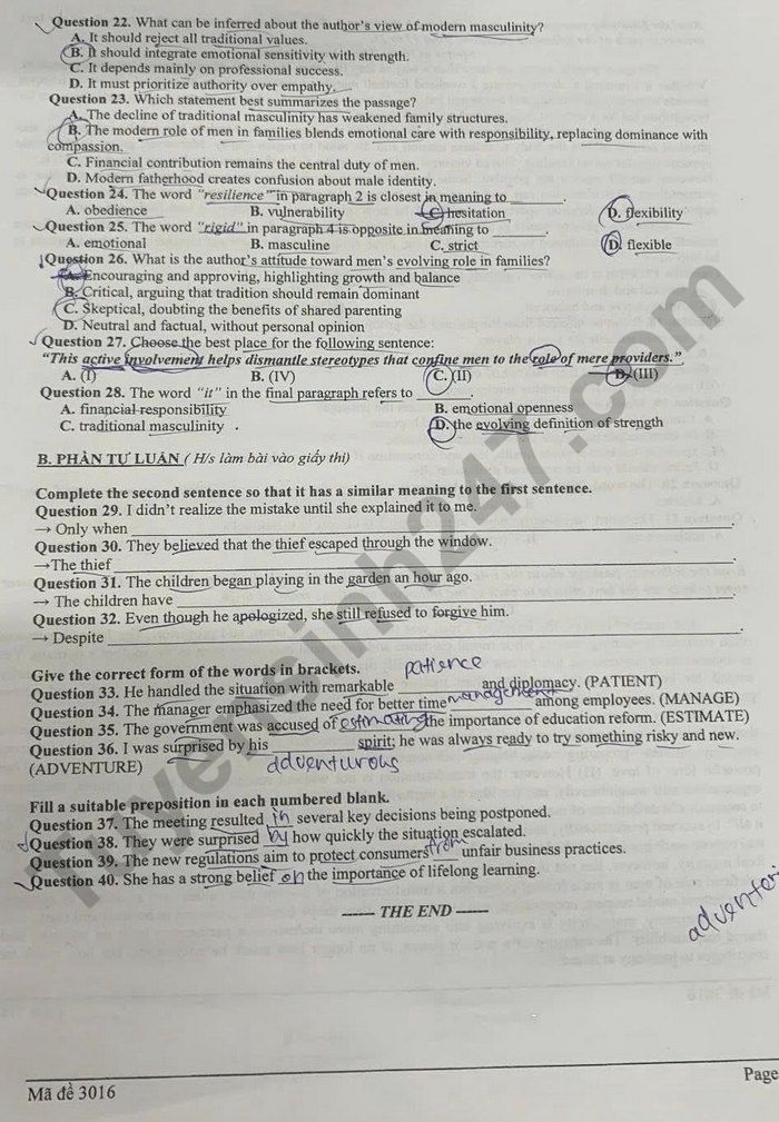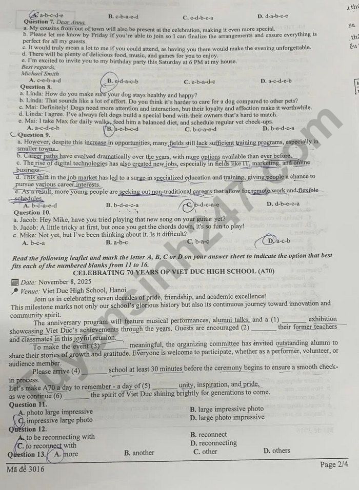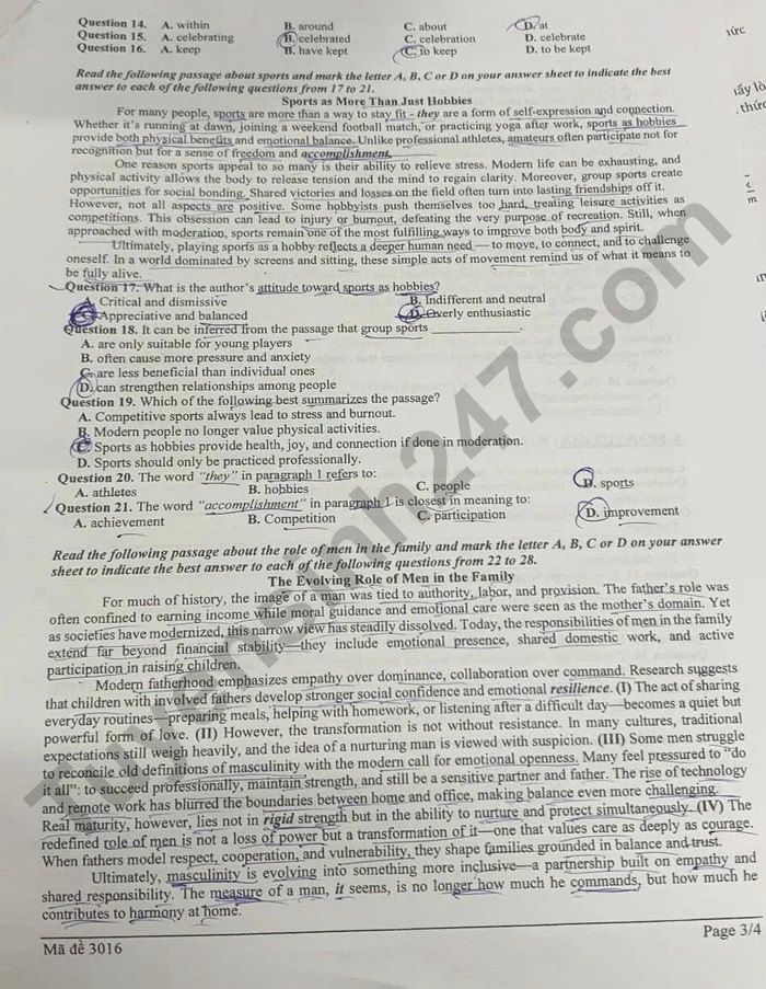 Lưu ý: Đáp án khoanh trong đề là bài làm của học sinh, có thể không chính xác