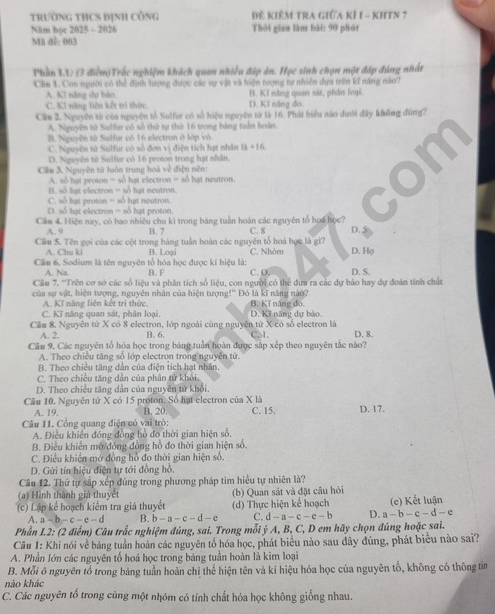 Đề thi giữa kì 1 năm 2025 THCS Định Công - lớp 7 KHTN