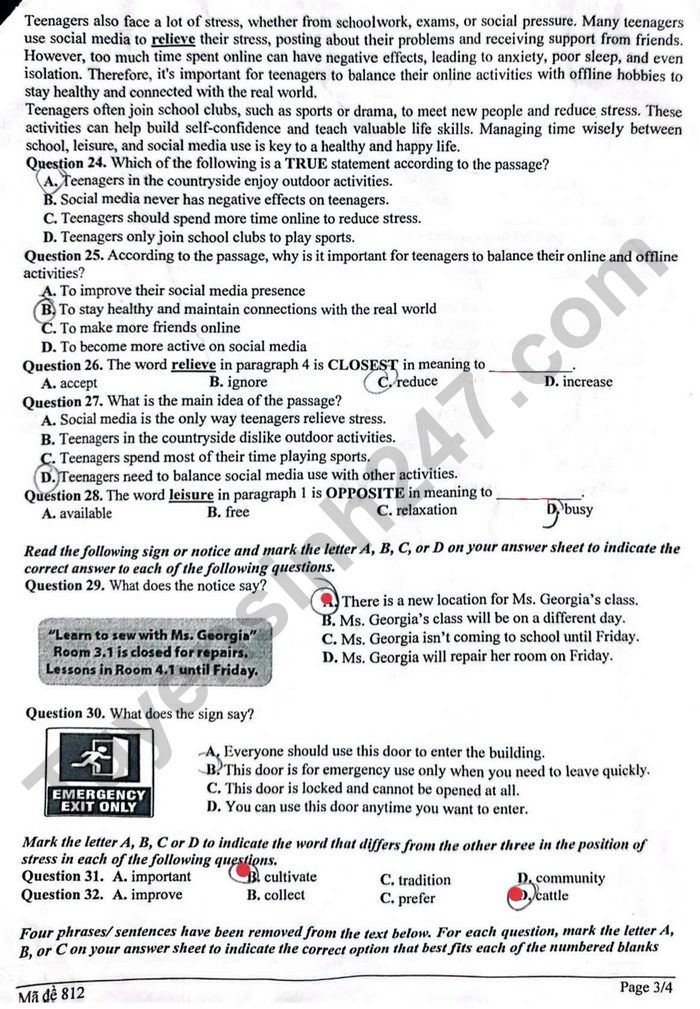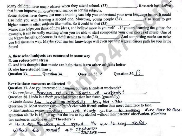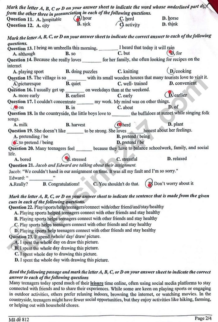 Lưu ý: Đáp án trong đề là bài làm của học sinh, có thể không chính xác
