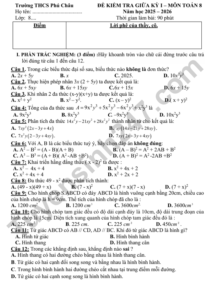 Đề thi giữa kì 1 năm 2025 THCS Phú Châu - lớp 8 môn Toán (có đáp án)
