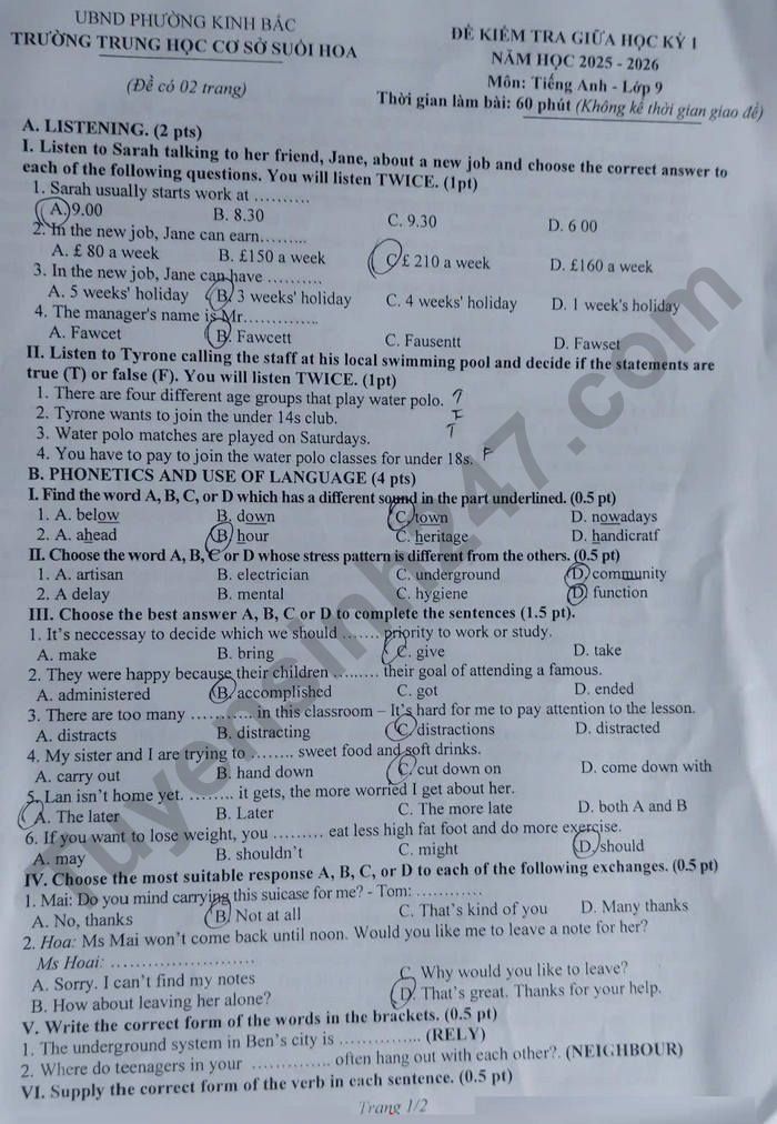 Đề thi giữa kì 1 năm 2025 THCS Suối Hoa - môn Anh lớp 9