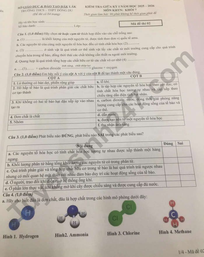 Đề thi giữa kì 1 năm 2025 THCS-THPT Đông Du - lớp 7 môn KHTN