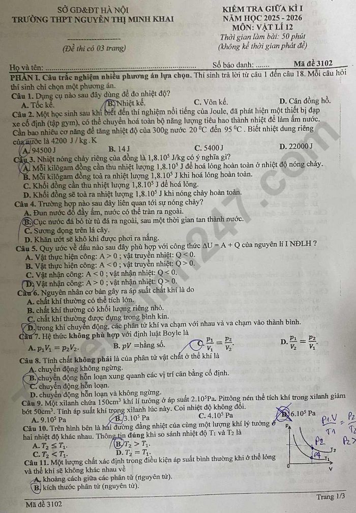 Đề thi giữa kì 1 năm 2025 THPT Nguyễn Thị Minh Khai - môn Lý lớp 12