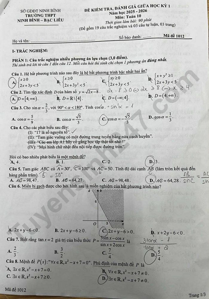 Đề thi giữa kì 1 năm 2025 THPT Ninh Bình-Bạc Liêu lớp 10 môn Toán