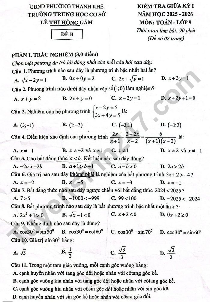 Đề thi giữa kì 1 Toán 9 THCS Lê Thị Hồng Gấm năm 2025