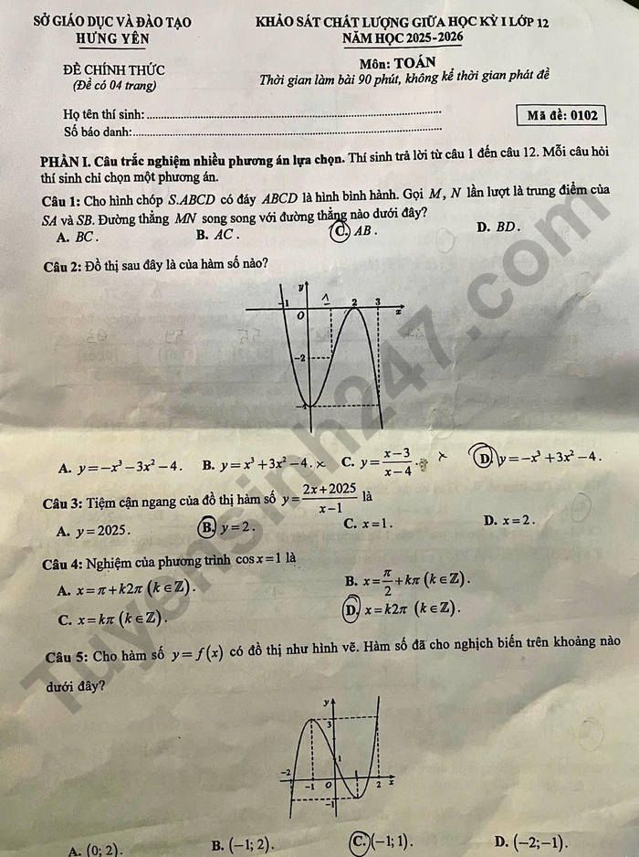 Đề thi giữa kì 1 Toán lớp 12 Sở GD Hưng Yên 2025