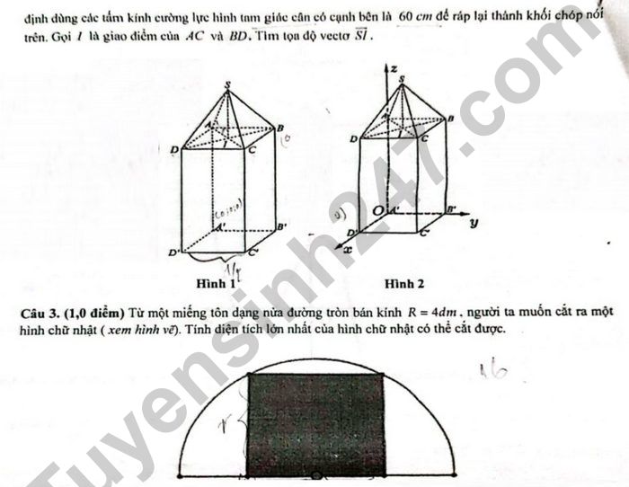 Câu 3. (1,0 điểm) Từ một miếng tôn dạng nửa đường tròn bán kính R = 4dm , người ta muốn cắt ra một hình chữ nhật ( xem hình vẽ). Tính diện tích lớn nhất của hình chữ nhật có thể cắt được.